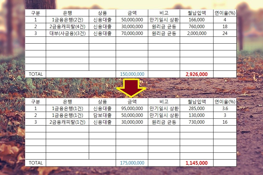 월불입금 감소, 대출사 9곳에서 3곳으로 채무통합하였고 신용등급 상승에 추가자금까지 확보!