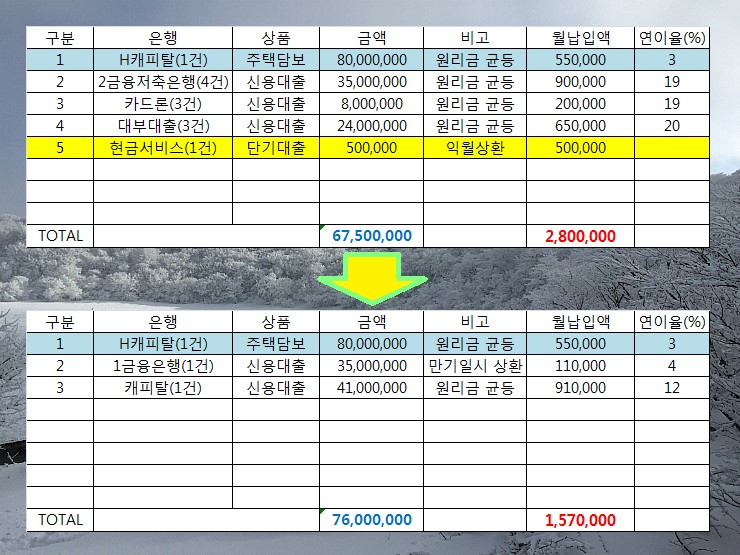 병원비 보탬이 될 자금은 소액 확보함.(신용등급 7->5 상향 / 대출건수 11->2건으로 감소)