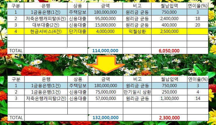 아래 노란색포인트 현금서비스 단기대출 400만원에서 250만원은 익월 일부상환해야함.