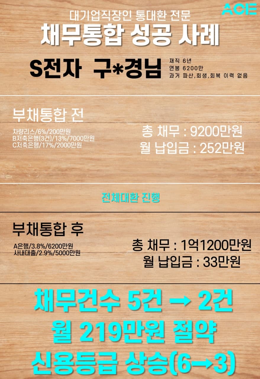 대출 전액을 저금리대출로 전환하고 신용등급 상승, 추가 자금 확보, 대출 건수 감소, 월 납입금 줄이고자 채무통합컨설팅 진행함.