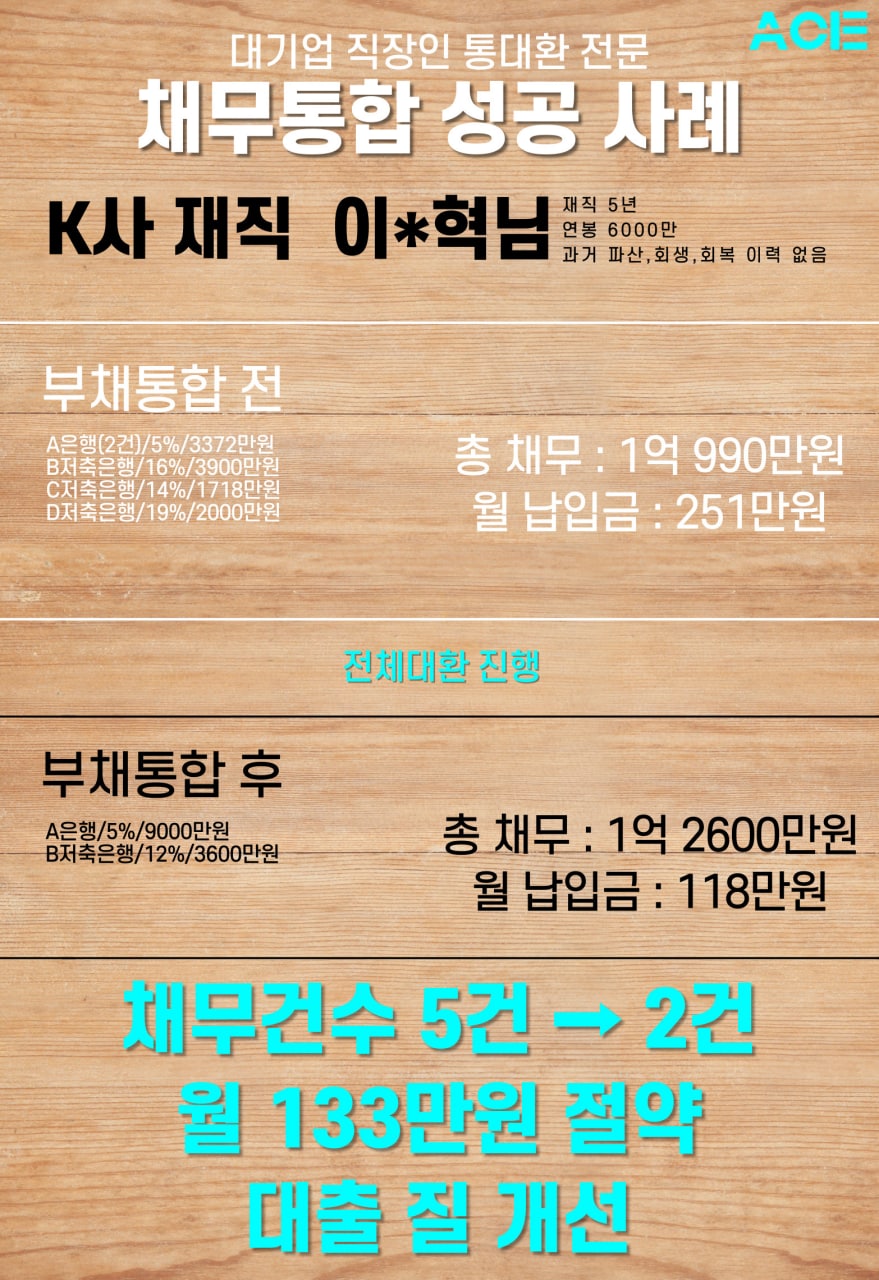 이*혁 고객님 대기업 K사 재직중으로 연봉 6000만원이며 A은행 2건 저금리 포함 전체 상환 컨설팅으로 진행.
